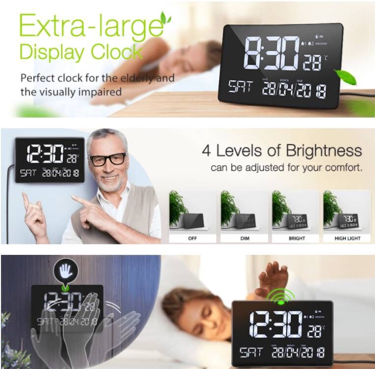 【Light-sensor for convenient operation 】 The light sensor in the top-middle of the screen allows you to wave hand to adjust the brightness or turn off the alarm, which is convenient and practical in daily life. No need to press any buttons.