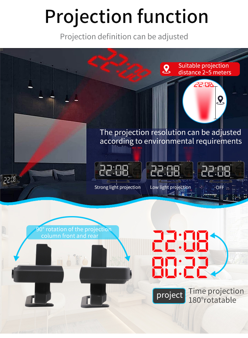 Led display projector vibrating alarm clock desktop electronic clock for bedroom