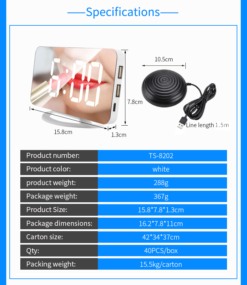 7. Power supply: USB cable (led keep lighting),built-in cell button ( RTC );